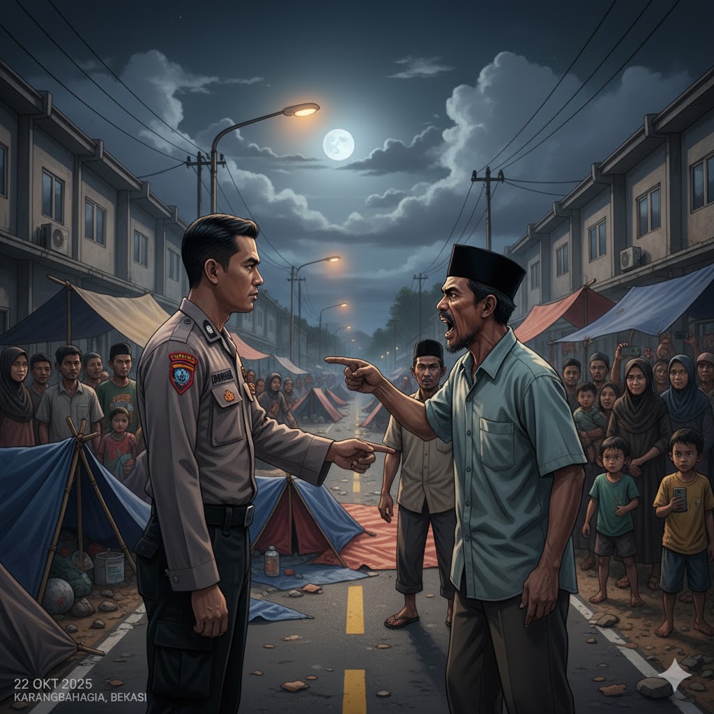 KARANGBAHAGIA, KABUPATEN BEKASI – Sebuah ketegangan melibatkan anggota Pembinaan Masyarakat Kepolisian (Bimaspol) dan seorang warga terjadi di Desa Sukaraya, Kecamatan Karangbahagia, Kabupaten Bekasi, pada Rabu malam (22/10/2025). Insiden ini dipicu oleh peneguran terhadap pendirian sejumlah tenda pengungsian di badan jalan yang hampir menutup akses utama menuju Perumahan Puri Nirwana Residence (PNR).